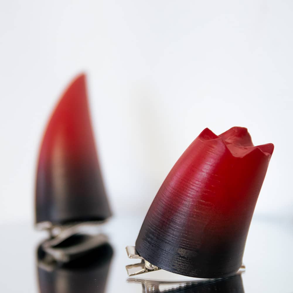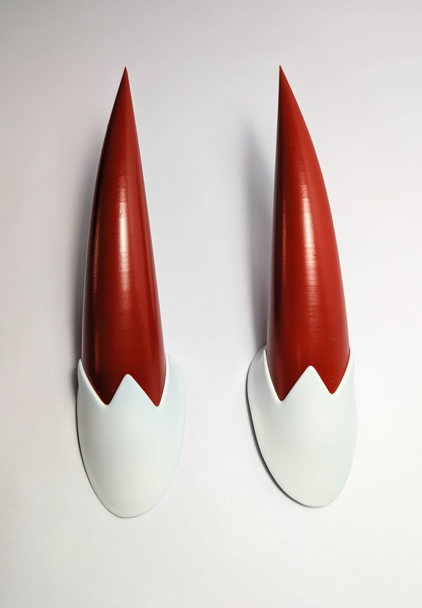 Each pair of cosplay horns is made to order. After printing, they are sanded, primed and painted to accentuate its texture before being sent off to you. We can make them for attachment with a hairclip, to a headband with magnets, or put attached directly to your head using cosmetic glue. If youre thinking of adding horns to a MiTail or MiWings order, let us know and we can match the colors. The price here is just a placeholder - there may be a change once we know what you have planned.[cuw_fbt]